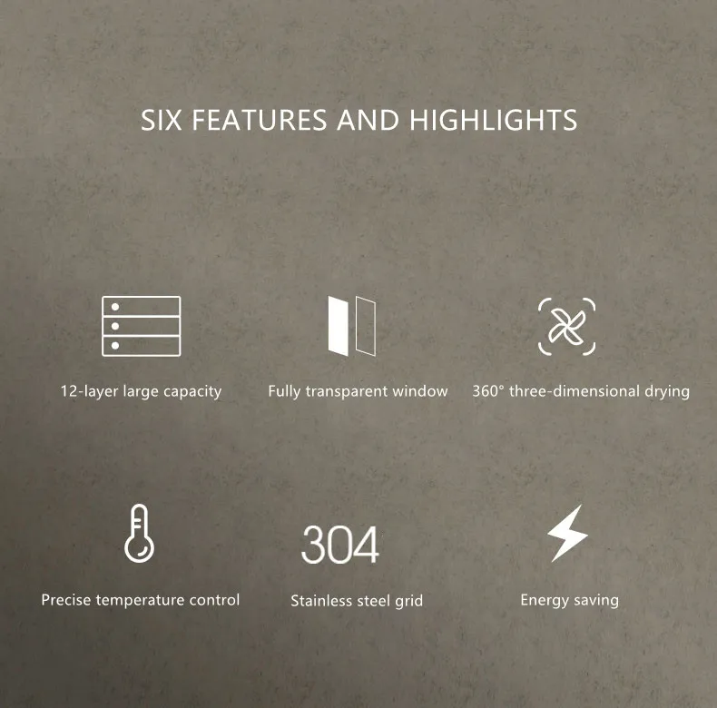 12-layer large capacity / Fully transparent window / 360° three-dimensional drying
