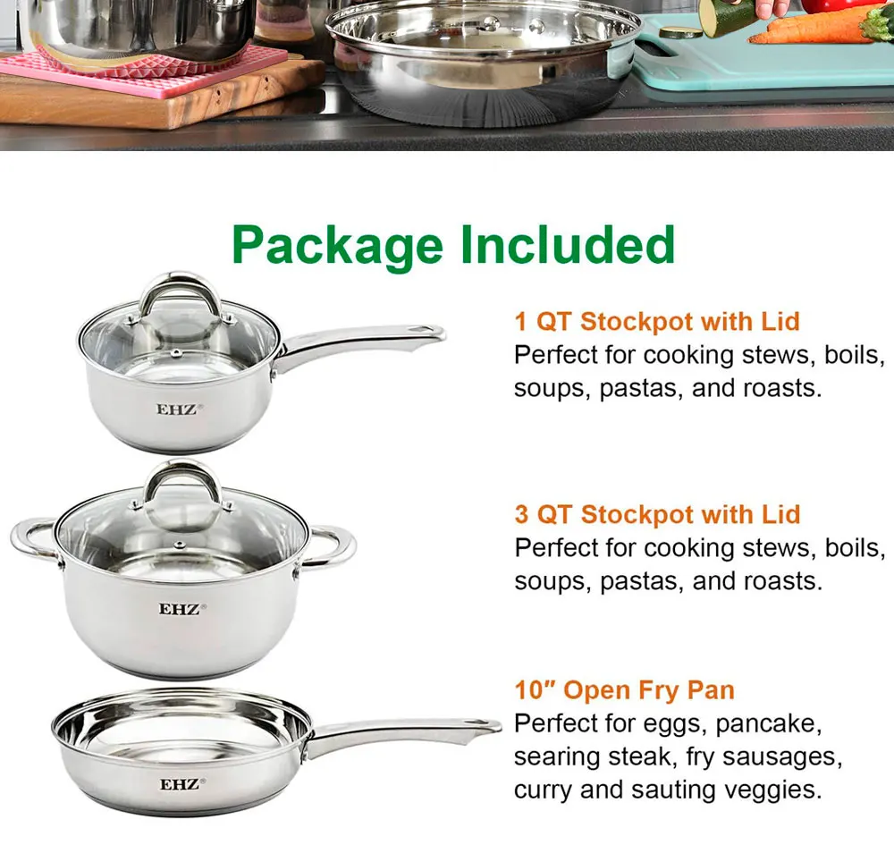 【5-piece Cookware Set Includes】1 quart saucepan with lid, 3 quart stockpot with lid and 10 inch fry pan. They are suitable for all cookers, such as gas, electric and induction. Ergonomic handle is more comfortable to hold when cooking.