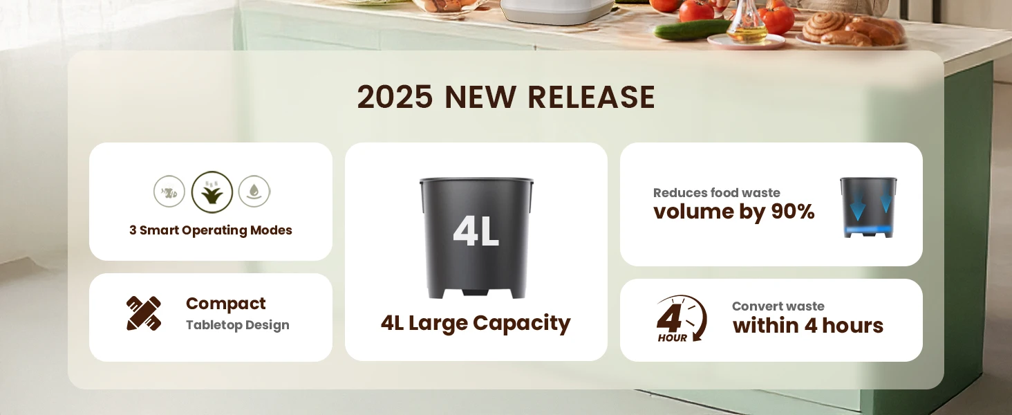 Convert kitchen waste into plant food with the press of a button. You can also add waste mid-run without restarting, and monitor the process through the transparent lid.