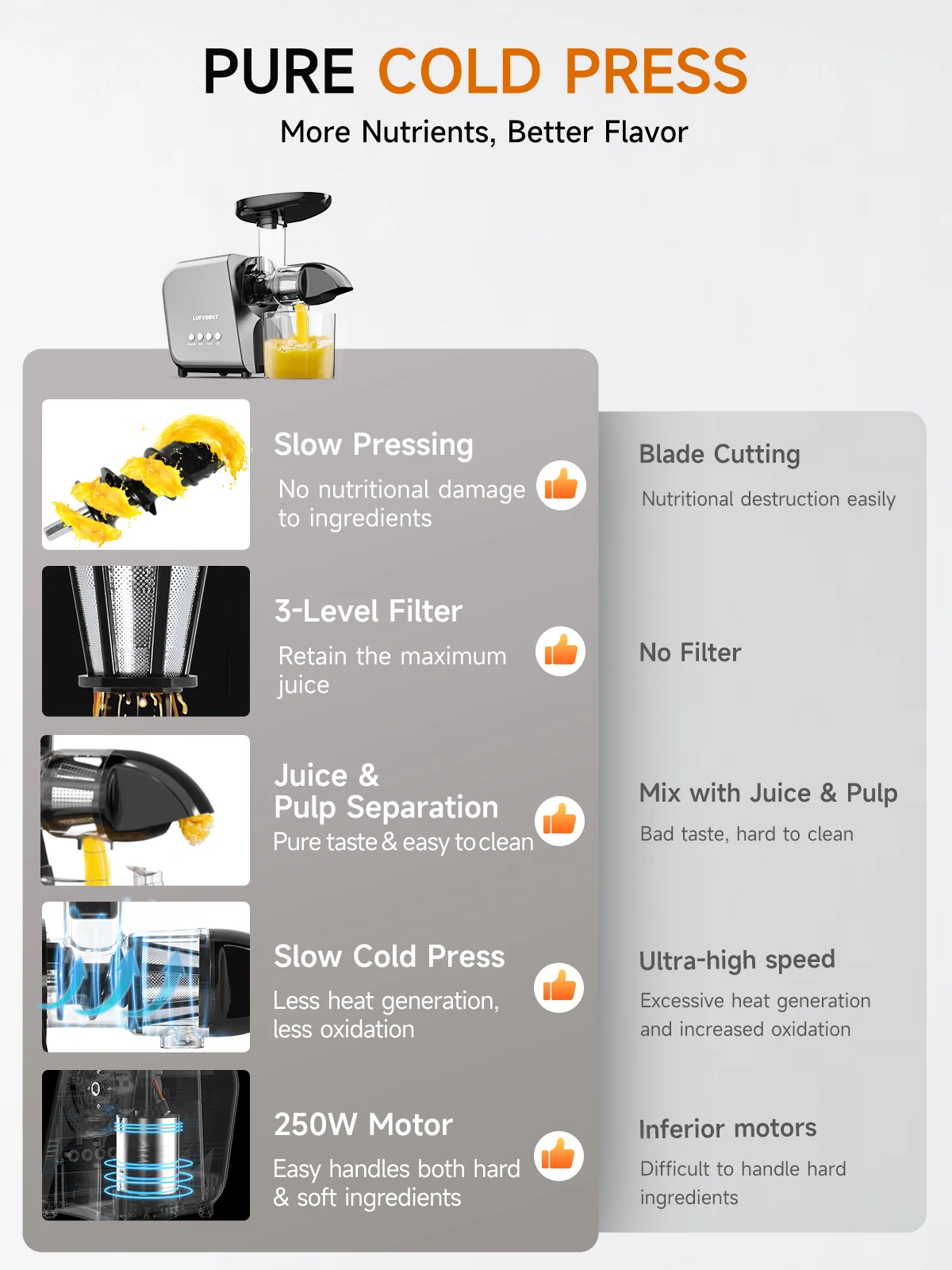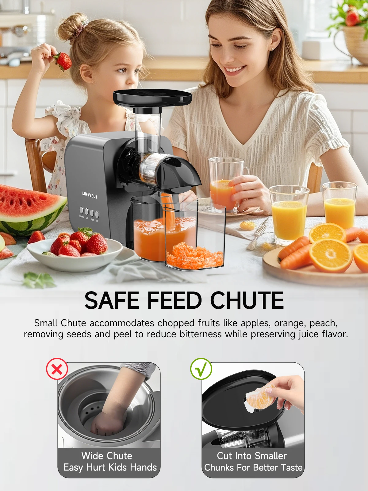 【Why Choose Our Slow Juicer】LUFVEBUT Juicer is hard to oxidize. Stable center of gravity, low noise. Power is more than 200W, the juice is high taste.