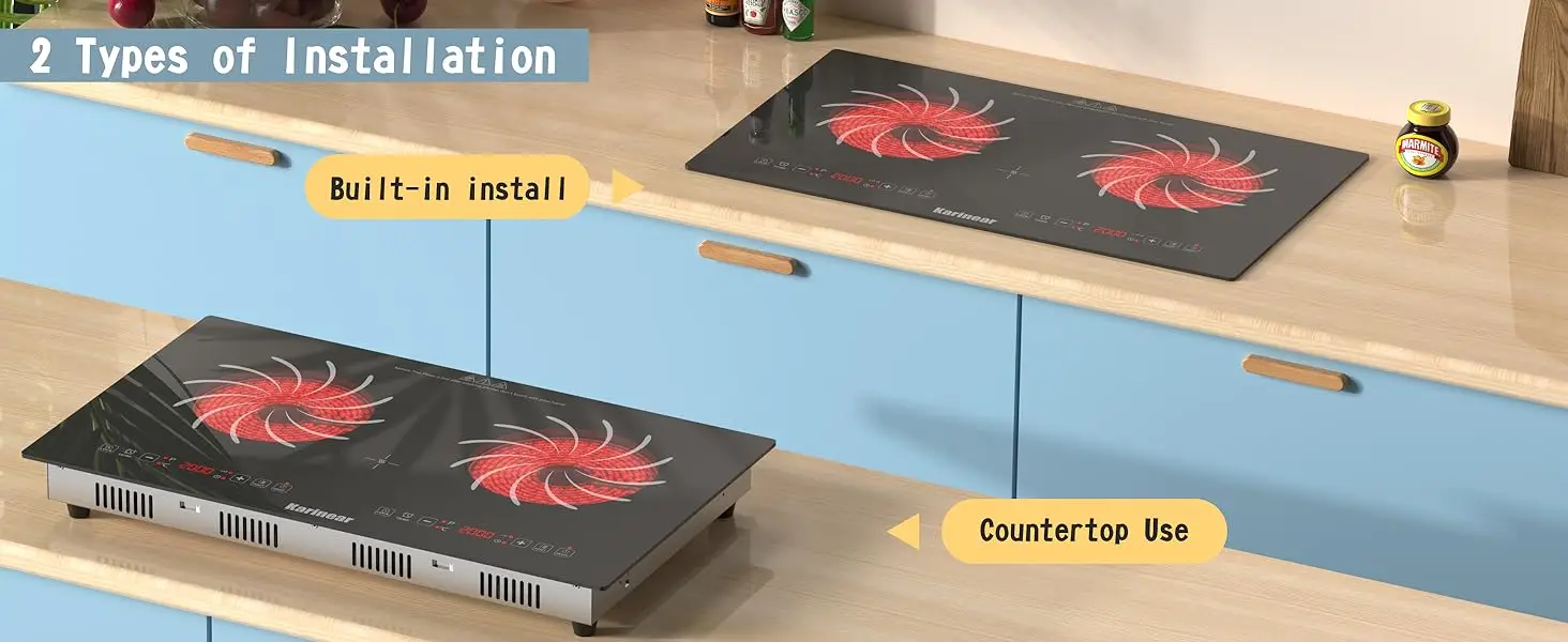 【COUNTERTOP & BUILT-IN COOKTOP】Our portable electric stove offers 2 installation options, whether drop-in install or placed directly on a tabletop because it have removable rubber feets. Opting for drop-in not only maximizes space but also enhances aesthetics, thanks to the sleek black glass surface. Cleaning glass cooktop is a breeze - a simple wipe with a damp cloth suffices. Plus, we've included a cleaning squeegee in the package for added convenience!