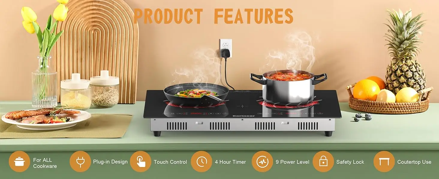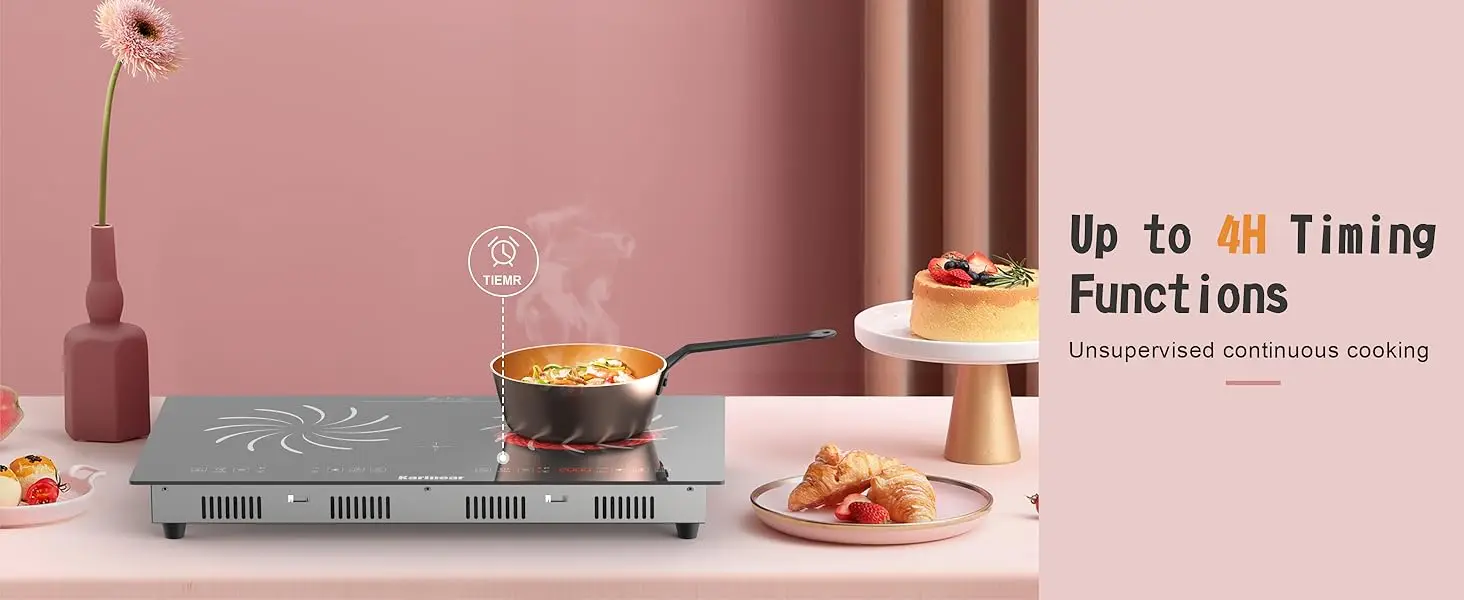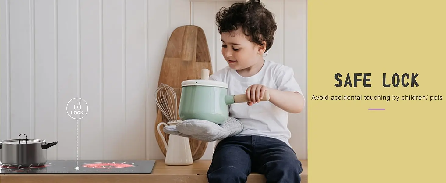 【1-99MINS TIMER & CHILD SAFETY LOCK】With the electric countertop stove top, you can set the timer anywhere from 0 to 99 minutes to suit your cooking requirements, ensuring ease and convenience for those long cooking sessions. Electric stove 2 burners also prioritizes safety with its child safety lock function. Prevent accidental adjustments post-cooking and keep curious kids away from harm by securing the device.