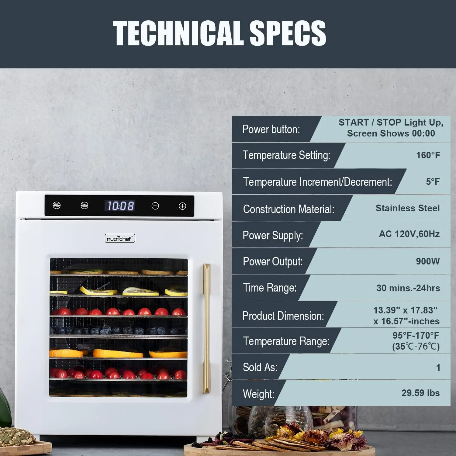 - 10 LAYER FOOD DEHYDRATOR: With a large capacity of 10 trays and the ability to dehydrate up to 36.8 lbs of food at once NutriChef's 10 layer dehydrator also have a 360° hot circulation, ensuring proper food preservation! Also easy to store & clean
