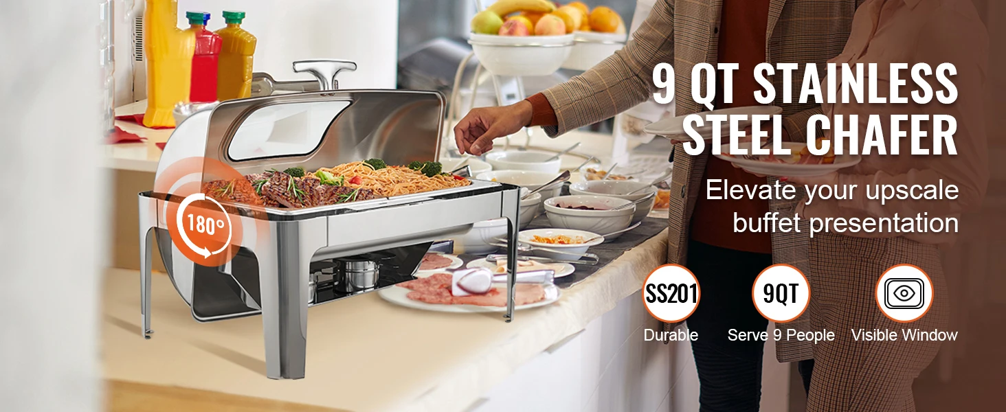Warm and Fresh: VEVOR's roll top chafing dish buffet set allow you to maintain the food’s temperature. Supported by fuel holders, our dish can heat food. Besides, you can also add enough ice to the water tray for cooling the food.