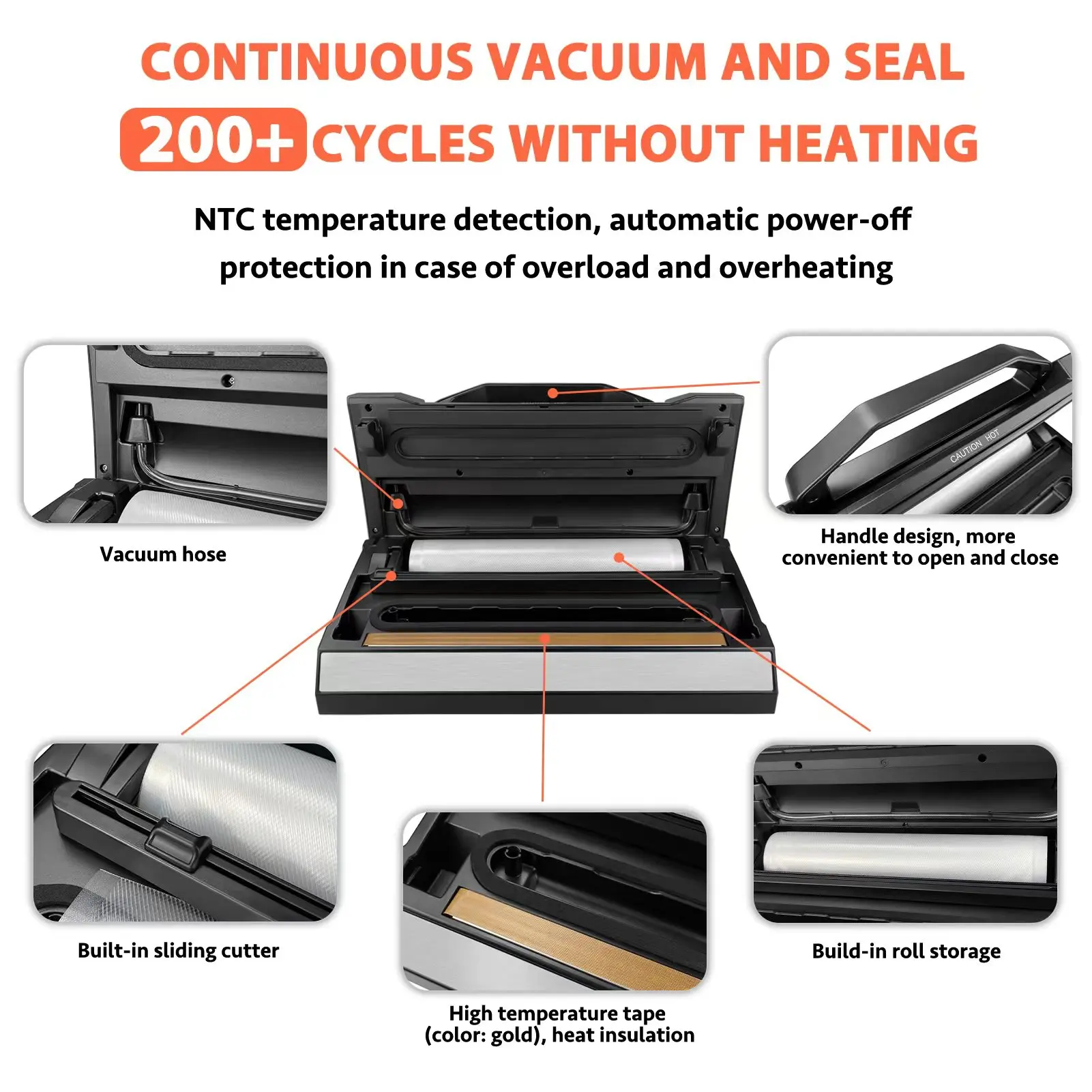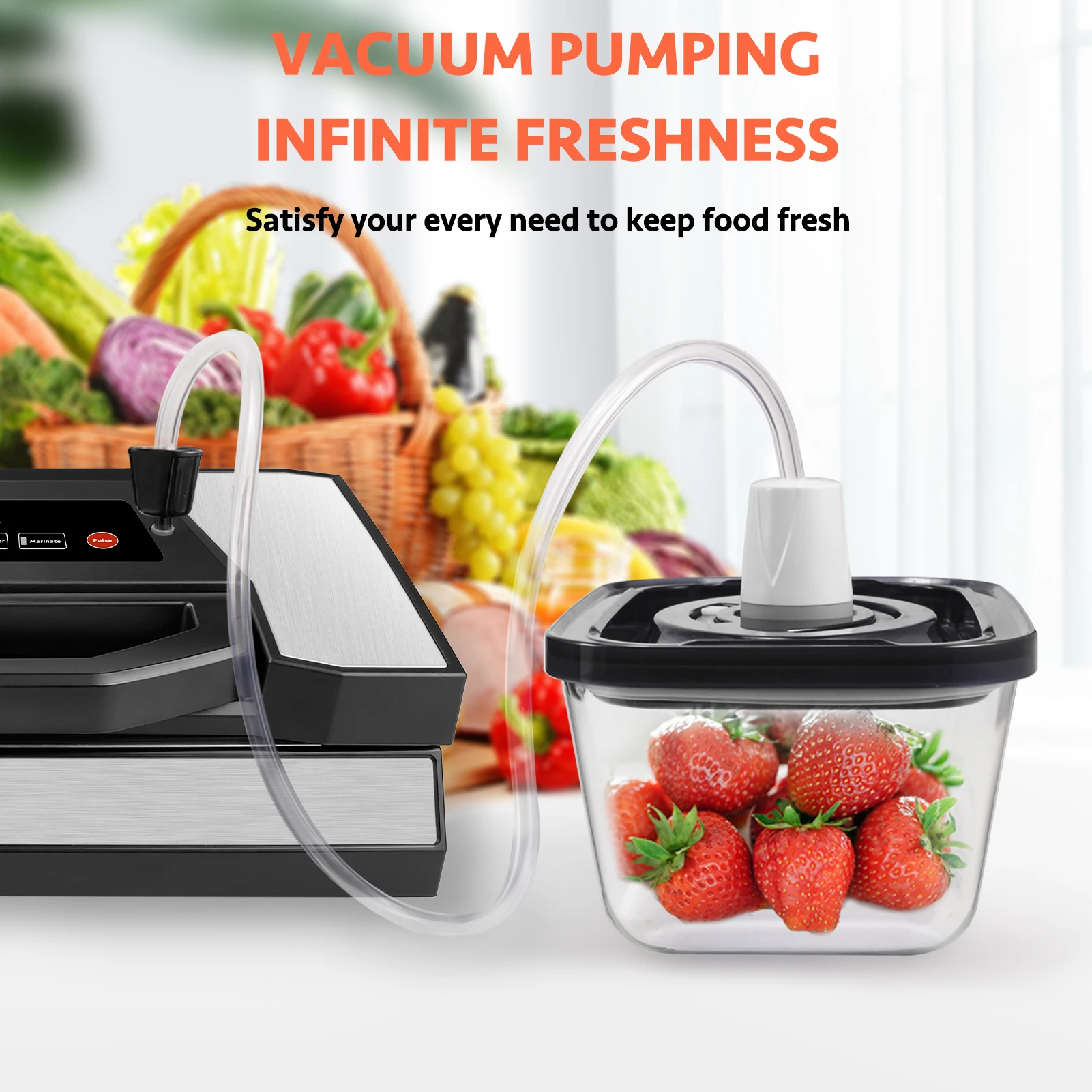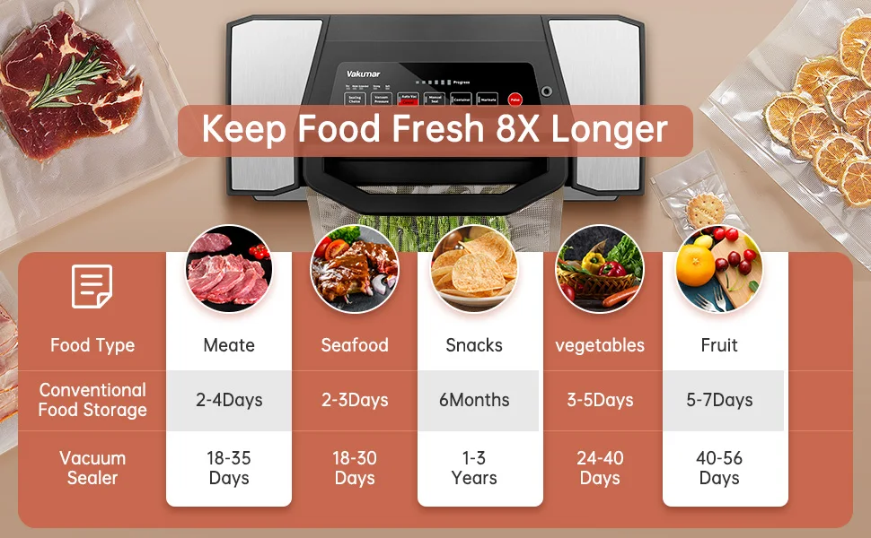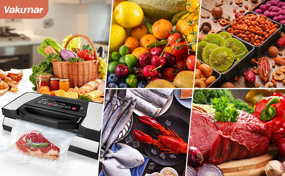 90kPa suction pump ensures optimal vacuum level, The efficient and quick sealing keep food fresh. It is suitable for the preservation of various foods, such as pickled beef, fresh fruits, vegetables, bread, greasy meat and flour.